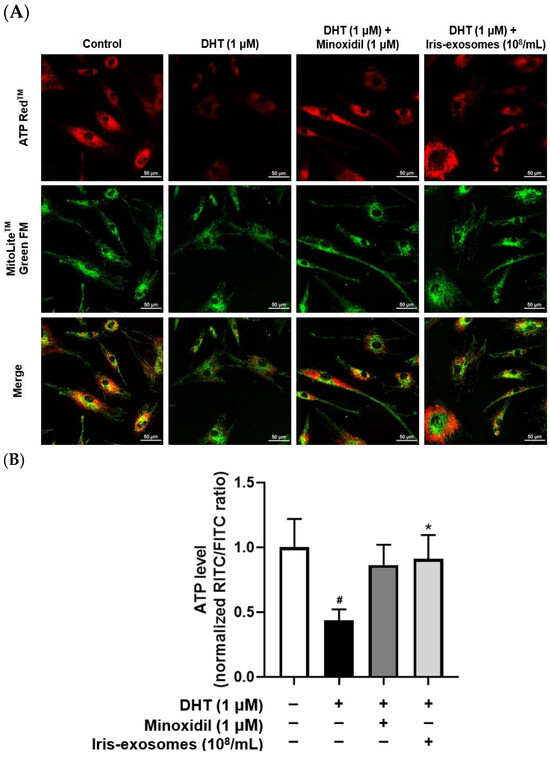 Effects of Iris-exosomes on ATP levels in HFDPCs stimulated by DHT. The ATP assay was conducted on HFDPCs treated with 1 µM DHT, followed by treatment with Iris-exosomes (108 particles/mL) or 1 µM MIX for 24 h. (A) Representative fluorescence images. Red fluorescence represents ATP levels, while green fluorescence indicates mitochondria. Images represent one of three independent experiments (scale bar 50 µm). (B) ATP levels were analyzed using ImageJ software, version 1.53e, and data are presented as mean ± SD (n = 3). Statistical significance is marked as * p < 0.05 relative to the DHT-treated group. # p < 0.05 compared with the control group.