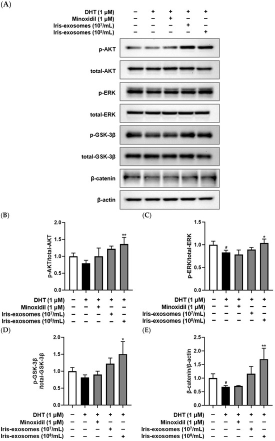 HFDPCs were incubated for 24 h in a 5% CO2 incubator. The cells were treated with 1 µM DHT, Iris-exosomes (107 and 108 particles/mL), and 1 µM MIX for 24 h. To achieve final concentrations of 107 and 108 particles/mL, 10 µL or 100 µL of a 1010 particles/mL stock solution were added to 10 mL of medium, respectively. Following treatment, the cells were rinsed twice with DPBS and lysed using a RIPA lysis and extraction buffer (Thermo Fisher Scientific, Waltham, MA, USA). Protein concentrations were determined using a Pierce™ BCA Protein Assay Kits (Thermo Fisher Scientific, Waltham, MA, USA). A total of 30 µg of protein extracted from the cell lysates was prepared for analysis. The proteins were separated by sodium dodecyl sulfate–polyacrylamide gel electrophoresis (SDS-PAGE) at 120 V for 2 h and subsequently transferred overnight onto a polyvinylidene fluoride membrane (Roche, Mannheim, Germany). After blocking, the primary antibodies targeting p-AKT (4060S), AKT (9272S), p-ERK (9101S), and ERK (9102S) (Cell Signaling Technology, Beverly, CA, USA) were diluted 1:1000 in blocking solution. Primary antibodies against β-catenin (SC-59737) and p-GSK-3β (SC-373800) (Santa Cruz Biotechnology, Dallas, TX, USA) were diluted 1:500 in blocking solution. These primary antibodies were incubated overnight. The membrane was washed three times using TBS-T (Bio-Rad Inc., Hercules, CA, USA). HRP-linked antibodies (Cell Signaling Technology, Beverly, CA, USA) were applied for 1 h and then washed three times. Protein bands were detected using an ECL reagent (Cytiva, Marlborough, MA, USA), and images were acquired using the Invitrogen iBright 1500 system (Waltham, MA, USA) and analyzed with Fiji ImageJ (Win 64-bit) software, version 1.53e.