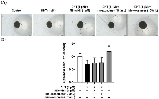 Effects of Iris-exosomes on the formation of 3D spheroid in DHT-damaged HFDPCs. Treatments with 1 µM DHT, 1 µM MIX, and Iris-exosomes (107 and 108 particles/mL) were administered at 2-day intervals. Images were captured after 21 days of culture. (A) Representative 3D spheroid images were acquired using a phase-contrast microscope, showing results from one of three independent experiments (scale bar 20 µm). (B) Quantification of 3D spheroid size was conducted using ImageJ software, version 1.53e. Data are presented as mean ± SD (n = 3), with statistical significance marked as * p < 0.05 compared with the DHT-treated group.