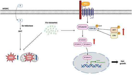 The activation of the Wnt/β-catenin signaling pathway stimulates the expression of genes involved in cell cycle progression [87]. By stabilizing β-catenin, this pathway enables its translocation into the nucleus, where it activates genes essential for hair follicle proliferation and growth [88,89]. In addition, ERK and AKT play critical roles in the Wnt/β-catenin pathway. Both proteins phosphorylate upstream components, enhancing β-catenin stability and promoting Wnt signaling [34]. Specifically, AKT inhibits GSK-3β by phosphorylating it at Ser9, thereby preventing β-catenin degradation [90]. Meanwhile, ERK amplifies β-catenin signaling, contributing to enhanced cellular responses, including hair follicle proliferation and regeneration [91]. Our study demonstrated that Iris-exosome treatment increased the phosphorylation levels of AKT, ERK, and GSK-3β, key regulators of the Wnt/β-catenin signaling pathway. This upregulation was accompanied by a significant increase in β-catenin expression, suggesting that Iris-exosomes stabilize β-catenin by preventing its degradation (Figure 8).