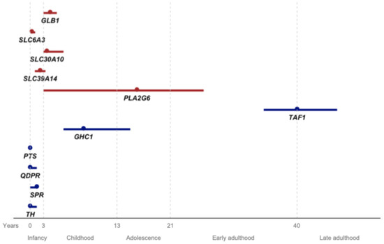 In Figure 1, we present the AAO for the conditions associated with the genes reviewed in this article, as well as those previously reviewed by MDSGene (TAF1, GHC1, PTS, QDPR, SPR, and TH) [5,6]. Some of these latter genes (PTS, QDPR, SPR, and TH) are linked to childhood-onset diseases, overlapping with the AAO of the genes discussed in the present study, particularly SLC6A3. While certain features like seizures or oculogyric crisis may be found in GLB1 and PTS, or SLC6A3 and SPR, respectively, levodopa response is more inconsistent in GLB1, SLC6A3, SLC30A10, and SLC39A14, and should guide the diagnosis. The childhood onset of GHC1-associated disease may overlap with PLAN; however, when PLAN manifests before adolescence, it is typically accompanied by a much more severe phenotype with additional neurological symptoms. Lastly, TAF1 has a distinct AAO, unique demographic characteristics (Filipino ancestry), and genetic features (X-linked), clearly distinguishing it from other diseases.