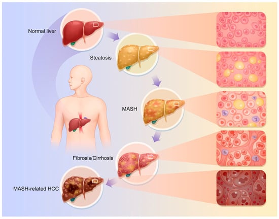 MASH is characterized by the histological features of hepatocellular ballooning and lobular inflammation. This stage involves hepatic-steatosis-related inflammation and cellular damage. MASLD progresses from a simple lipid buildup to MASH due to increased liver inflammation, oxidative stress, and hepatocyte apoptosis and necrosis [,,,,,]. Lymphocytes, monocytes, and neutrophils infiltrate liver tissue. Hepatocellular macrovesicular steatosis following damage is slow. Fat buildup damages hepatocyte organelles, causing ballooning changes []. This alters the intracellular osmotic pressure and causes significant water inflow; endoplasmic reticulum pools dilate, mitochondrial cristae decrease, and the organelle structure becomes disorganized []. This causes the hepatocytes, which have balloon-shaped, loose, hyaline cytoplasm, to grow []. Additionally, this process causes liver apoptosis, which manifests as hepatocyte wrinkles, nuclear chromatin condensation, and marginalization, resulting in apoptotic vesicles [,,]. This could result in necrosis, which causes a stronger inflammatory response in the tissue around the necrotic hepatocytes. With this process, hepatocyte membranes burst, spilling cell contents into the extracellular space. Leaking cytoplasmic elements include enzymes and organelles. Hepatocyte oedema and inflammation cause the liver to swell macroscopically, making it fragile and without sharp edges. A palpable nodule and oily feeling may indicate advanced stages.