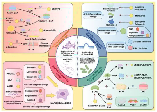 A summary of MASLD-associated targets and their respective targeted therapies. Topics covered include steatosis, MASH, fibrosis, cirrhosis, MASH-related HCC, and the influence of gut microbiota and miRNAs on metabolism and disease progression.