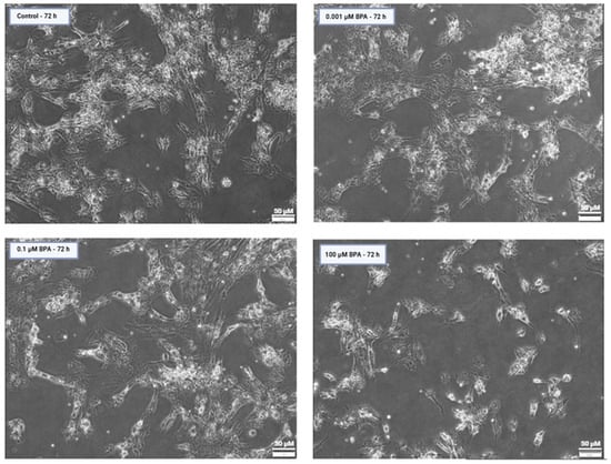 Phase-contrast images of human granulosa cells at 20× magnification, directly exported from the CellSens app, showing attachment to the bottom of the culture dish after 72 h of incubation in a control group and at different concentrations of BPA. The cells exhibit a mesenchymal-like phenotype, with a noticeable reduction in cell density at 100 µM BPA compared with the other conditions. The images were captured using an Olympus IX73 microscope and the CellSens 3.2. software, (Evident Corporation, Tokyo, Japan). Scale bar: 50 µm.