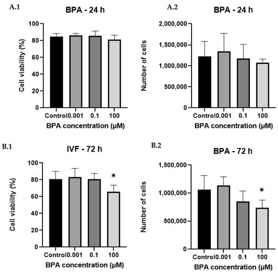The effects of different BPA concentrations and exposure times on human granulosa cell viability and cell numbers compared with the BPA non-treated control. After 24 h (A.1,A.2), there were no statistically significant differences in either cell viability or cell number. However, after 72 h of BPA exposure (B.1,B.2), BPA at a concentration of 100 µM caused a significant decrease in both cell viability and cell count. * Statistically significant (p < 0.05).