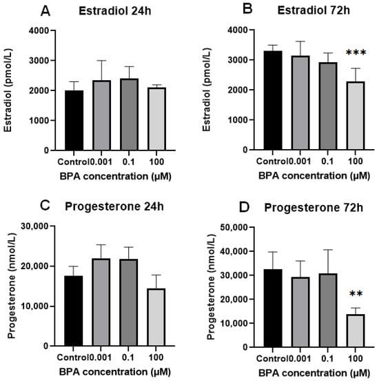 In vitro estradiol and progesterone production assessed using spent culture medium analysis. After 24 h, there was no significant effect of BPA on estradiol (A) and progesterone (C) biosynthesis in vitro. However, a trend was observed where lower BPA concentrations (0.001 µM, 0.1 µM) appeared to increase the production of both estradiol and progesterone. After 72 h, a concentration of 100 µM BPA significantly reduced the synthesis of both estradiol (B) and progesterone (D) (p = 0.0004 and p = 0.0050, respectively). The control values at 72 h were 3304.0 ± 198.4 pmol/L for estradiol (B) and 32,508.0 ± 7339.0 nmol/L for progesterone (D). ** statistically significant at p < 0.01; *** statistically significant at p < 0.001.