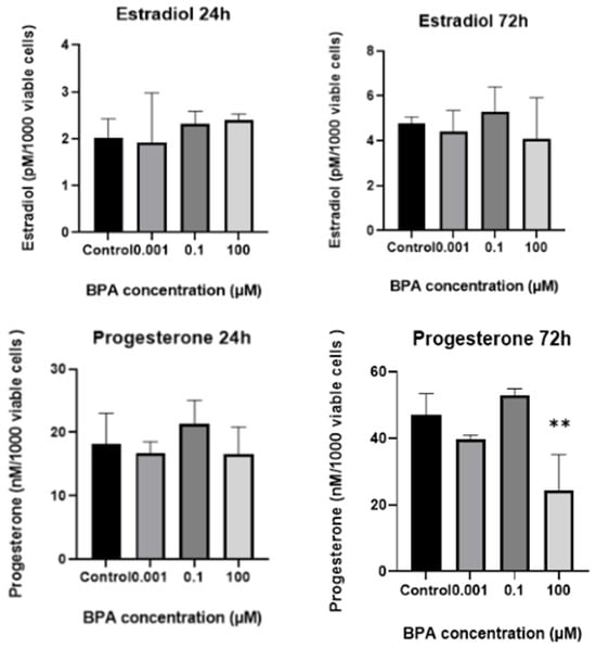In vitro estradiol and progesterone production assessed using spent culture medium analysis. The bar charts display progesterone and estradiol concentrations, normalized to 1000 viable cells following 24 and 72 h of exposure to BPA concentrations of 0.001 µM, 0.1 µM, and 100 µM. For estradiol, no significant differences were observed among the groups at either 24 or 72 h of BPA exposure. For progesterone, no significant differences were observed among the groups at 24 h; however, after 72 h, there was a significant decrease in progesterone production at 100 µM concentration of BPA compared with the control group (p = 0.00632). ** statistically significant (p < 0.01).