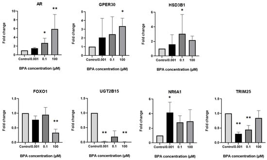Effects of different concentrations of BPA on the expression of genes associated with steroidogenesis in granulosa cells after 72 h of exposure. Total messenger RNA (mRNA) was extracted, reverse transcribed, and amplified using qPCR. Gene expression was normalized using the geometric mean of three reference genes (GAPDH, HPRT1, and GUSB). The results are expressed as the fold change (2^(−ΔΔCT) ± standard deviation. This figure shows genes with significantly altered expression. At 0.001 µM, BPA significantly changed the expression of NR6A1 (p = 0.0270), TRIM25 (p = 0.0011), and UGT2B15 (p = 0.0030). At 0.1 µM, BPA significantly changed the expression of AR (p = 0.0400), HSD3B1 (p = 0.0409), and TRIM25 (p = 0.0098). At 100 µM, BPA significantly changed the expression of AR (p = 0.0016), GPER30 (p = 0.0151), FOXO1 (p = 0.0025), and UGT2B15 (p = 0.0031). * statistically significant at p < 0.05, ** statistically significant at p < 0.01.