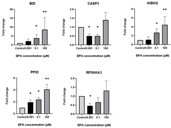Effects of different concentrations of BPA on the expression of genes associated with apoptosis in granulosa cells after 72 h of exposure. Total messenger RNA (mRNA) was extracted, reverse transcribed, and amplified using qPCR. Gene expression was normalized using the geometric mean of three reference genes (GAPDH, HPRT1, and GUSB). The results are expressed as the fold change (2^(−ΔΔCT) ± standard deviation). This figure shows significantly altered expression of genes after 72 h of incubation. At 0.001 µM, BPA significantly changed the expression of CASP3 (p = 0.0185), PPID (p = 0.045), and RPS6KA3 (p = 0.0336). At 0.1 µM, BPA changed the expression of BID (p = 0.0410), CASP3 (p = 0.0134), IKBKG (p = 0.0412), and PPID (p = 0.0370), while at 100 µM, BPA changed the expression of BID (p = 0.0042), IKBKG (p = 0.0053), and PPID (p = 0.0062). * statistically significant at p < 0.05, ** statistically significant at p < 0.01.