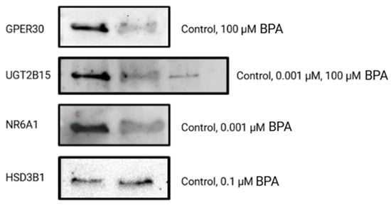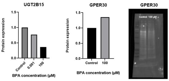 Similar to gene expression, exposure of GCs to a 100 µM concentration of BPA increased the expression of GPER30 and decreased the expression of UGT2B15, both associated with steroidogenesis (Figure 8). However, the differences were relatively small (1.35-fold change at 100 µM BPA for GPER30, 0.77-fold change at 0.001 µM BPA, and 0.36-fold change at 100 µM BPA for UGT2B15) compared with the control. We could not confirm the quantitative differences for the other proteins (Figure S3), mainly due to a limited amount of material available for analysis. Uncropped membranes and no-stain labelling pictures are depicted in Figure S2.