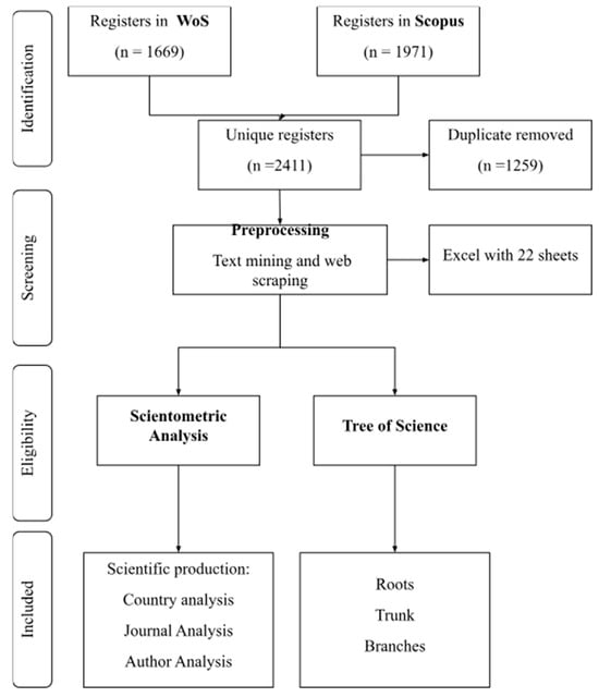 The search yielded 1669 results in WoS and 1971 in Scopus. After data cleaning and removing duplicates, 2411 records remained (Figure 1). From this dataset, the metadata of the articles were extracted to conduct the scientometric analysis and document prioritization using the ToS algorithm.