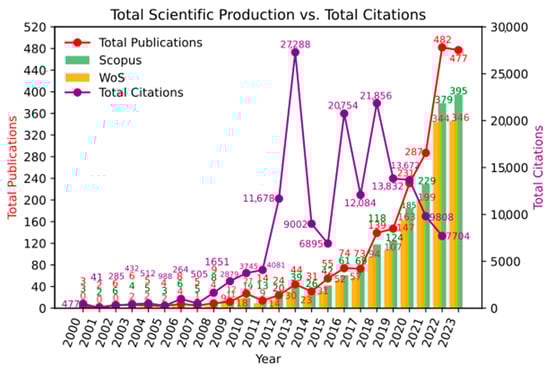 The methodology consisted of four stages. The first stage involved a literature search conducted in the WoS and Scopus databases, using the following equation: (TITLE (“human microbiome” OR microbiota OR “intestinal microbiome” OR prebiotics OR probiotics OR posbiotics) AND TITLE (biochemistry OR metabolism OR metabolomics)) AND (LIMIT-TO (DOCTYPE, “ar”) OR LIMIT-TO (DOCTYPE, “re”)). The search was confined to the fields of Medicine; Biochemistry, Genetics and Molecular Biology; Immunology and Microbiology; Pharmacology, Toxicology and Pharmaceutics; and Chemistry, covering the period from 1972 to 5 December 2024. The second stage pertained to data cleaning, where the search results from each database and the cited references of each article were downloaded and merged into a single dataset, with duplicate records removed. The third stage involved a scientometric analysis of the data, examining the dynamics of scientific production, the most prolific authors and journals, and collaborations among countries and authors. Finally, an automated prioritization of the articles was performed using the Tree of Science (ToS) algorithm [10].