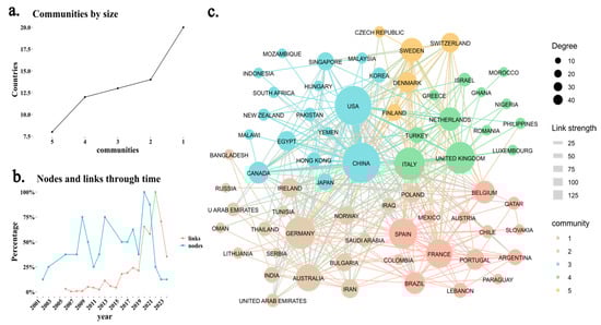 Scientific collaboration network among countries. (a) Distribution of scientific communities based on a clustering algorithm, identifying five distinct communities of collaborating countries. (b) Evolution of new scientific collaborations over time, where “nodes” represent newly added countries in the network, and “links” indicate newly established collaborations between countries in each year. (c) Network Scientific collaboration between countries, based on author affiliations. The size of each node represents the degree (number of connections), while the color indicates community membership. Link thickness represents the collaboration strength, with thicker links indicating stronger ties between countries.