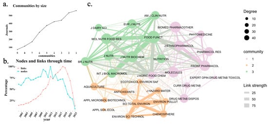 Figure 4a shows that nine journal communities were identified in the overall dataset. Among them, Communities 1 and 2 are the largest, indicating that these research areas have the highest concentration of journals. Figure 4b reveals a stabilization in the proportion of new journals compared to new citation links from 2015 onwards, confirming the consolidation of this research field. Finally, Figure 4c presents the citation network among journals, highlighting three distinct communities represented in green, orange, and purple. The thickness of the links indicates the strength of the connections, while node size corresponds to degree centrality, reflecting how many connections each journal has with others. The purple cluster is related to pharmacology, and the orange group focuses on the influence of the environment on the microbiome and microbiota [22,23]. The orange cluster also examines the effects of external factors, such as environmental pollutants and dietary interventions, on the gut microbiota and their association with various health outcomes [24,25]. Lastly, the green community explores the impact of the microbiome on nutrition, emphasizing the therapeutic potential of mushroom-derived polysaccharides in enhancing gut health and treating inflammatory diseases [26,27]. These clusters illustrate the interconnected research areas addressing the gut microbiota’s role in health and disease. The nodes and links through time analysis also show that, since 2014, citation links between journals have increased at a higher rate than the addition of new journals, reinforcing the idea that the most-cited journals in this field have solidified their influence.