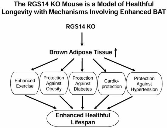 Enhanced longevity in humans is a double-edged sword. On the one hand, longevity is considered beneficial. On the other, longevity can also be detrimental, by increasing incidence of heart disease, cancer, obesity, diabetes and exercise intolerance. It is therefore critical to find mechanisms to enhance healthful longevity, which would likely be derived from animal models of healthful longevity. One model, the mouse with the regulator of G protein signaling 14 disrupted (RGS14 knockout (KO)) is likely to produce these new mechanisms, either through its genotype or secondarily to its brown adipose tissue (BAT). Our previous studies demonstrated that RGS14 KO mice exhibited extended lifespan, protection against cold exposure, improved thermogenesis and mitochondrial function through its unique BAT and upregulated SIRT3 [1]. In addition, RGS14 KO mice exhibited enhanced exercise capacity with improved anti-oxidant defense and blood flow/angiogenesis [2]. We have also found that BAT from this model of healthful longevity can recapitulate its salutary effects in mediating enhanced exercise capacity, metabolism, cardioprotection and lifespan and protection against hypertension (Figure 1) [1,2].