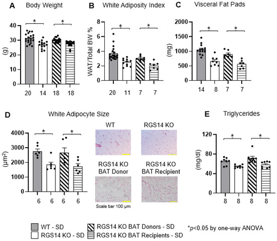 RGS14 KO mice consumed a similar amount of food, but body weight was lower (A), adiposity index was less (B), weight of visceral fat pads was lower (C), white adipocyte size was smaller with hematoxylin–eosin (H&E) staining (D) and triglycerides levels were lower (E), compared to WT littermates. After BAT transplantation, RGS14 KO BAT recipients exhibited similar trends to RGS14 KO mice, with lower body weight (A), less adiposity index (B), lower weight of visceral fat pads (C), smaller white adipocyte size (D) and lower triglycerides level (E), compared to RGS14 KO BAT donors. * p < 0.05 by one-way ANOVA with Tukey’s multiple comparisons test. X-axes represent the number of mice in the respective groups.