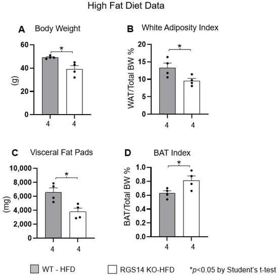 With a high-fat diet (HFD) challenge for 100 days, the RGS14 KO mice exhibited lower body weight (Figure 3A), lower WAT adiposity index (Figure 3B), lower visceral fat pad weight (Figure 3C) and greater BAT index (Figure 3D).
