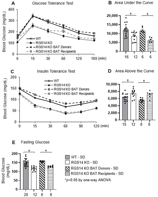 Compared with WT mice, RGS14 KO mice displayed improved glucose tolerance (A,B), enhanced insulin sensitivity (C,D) and reduced fasting glucose (E). After BAT transplantation, RGS14 KO BAT recipients exhibited similar trends as RGS14 KO mice, showing improved glucose tolerance shown as GTT curve (A) and GTT area under the curve (B), enhanced insulin sensitivity shown as ITT curve (C) and ITT area above the curve (D) and reduced fasting glucose (E), compared to RGS14 KO BAT donors. * p < 0.05 by one-way ANOVA with Tukey’s multiple comparisons test. X-axes represent the number of mice in the respective groups.