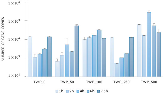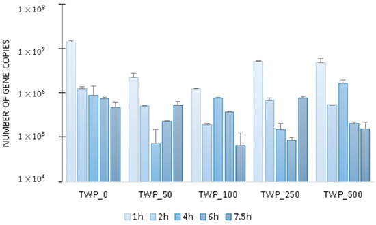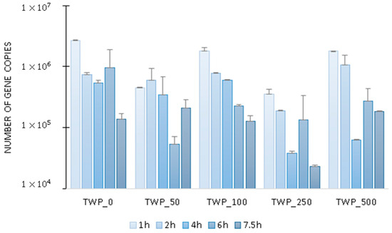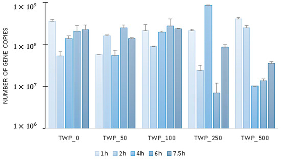 The effect of TWP on total microbiome activity was determined based on 16S rRNA gene expression. It was found that in the control reactor and the reactors operated with 2 lower doses of TWP, the level of 16S rRNA was similar, with increasing values at 6 and 7 h of the cycle (Figure 2). In the reactors operated with the two highest TWP doses, there was a significant decrease in microbial activity in the middle of the cycle: in TWP_500, the 16S rRNA copy number decreased from 399 ± 39 million transcripts at 1 h of the cycle to 10 ± 1 million transcripts at 4 h of GSBR operation. At the end of the cycle, activity slowly increased again. It can be assumed that the compounds released from TWP inhibited microbial activity, and that most microorganisms regained their activity after the metabolism of the substrates released from TWP. Examples of activity-inhibiting compounds that can be released from TWP are BPA, heavy metals, polycyclic aromatic hydrocarbons and aniline [34,37,38]. Additionally, it was determined that the largest divergence in the 16S rRNA gene copy number at different hours of the GSBR cycle occurred in the TWP_250 reactor.