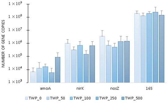The efficiency of wastewater treatment depends not only on the abundance of bacteria in the environment, but more importantly on their activity. A large number of nitrifying bacteria (e.g., Nitrosomonas sp.) and denitrifying bacteria (e.g., Thauera sp.) does not guarantee high efficiency of wastewater treatment process if their enzymatic activity is low [28]. To determine how selected compounds present in wastewater affect the wastewater treatment process, especially the most important processes such as nitrification and denitrification, molecular methods can be used. The most common markers for nitrification and denitrification processes are the genes coding for ammonium monooxygenase (amoA), nitrite reductase (nirK, nirS) and nitric oxide reductase (nosZ).