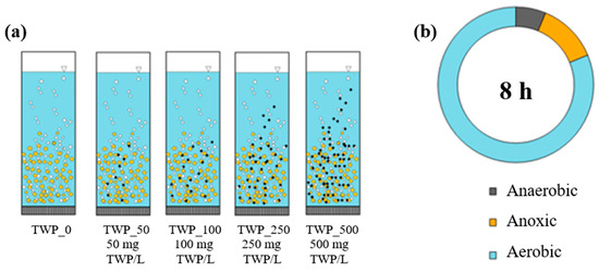 In this study, laboratory granular sludge batch reactors (GSBRs) with a working volume of 3 L and a diameter of 10 cm were used. The reactors were operated with programmable controllers at a volumetric exchange rate of 60%/cycle and at 20 °C. Air was supplied (4 L/min) via fine bubble diffusers at the bottom of the reactors. As inoculum, AGS from WWTPs in Lubawa was used. To the reactors, synthetic municipal wastewater [50] was added to avoid uncontrolled contamination with other MPs. Based on the preliminary study, the reactors (TWP_0–TWP_500) were fed with wastewater containing increasing TWP concentrations/L (Figure 7a). To produce TWPs, pristine tires from a leading global manufacturer were milled, and a fraction of 70–200 μm (the most abundant was selected by sieving [51]. An anaerobic/anoxic/aerobic regime applied in the 8 h GSBR cycle is shown in Figure 7b. Each GSBR was operated for more than 300 cycles. The mixed liquor suspended solids in the GSBRs was maintained at about 6 g MLSS/L (grams of mixed liquor suspended solids per liter).