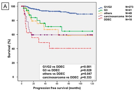 Kaplan–Meier analysis of progression-free survival (A) and overall survival (B). G1/G2, grade 1 and 2 endometrioid carcinoma; G3, grade 3 endometrioid carcinoma; others, other carcinomas; DDEC, dedifferentiated endometrioid carcinoma.