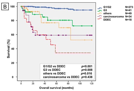 The 5-year PFS and OS rates for DDEC were approximately 40% and 30%, respectively, with a significantly poorer prognosis than grade 1/2 endometrioid carcinoma, grade 3 endometrioid carcinoma, and other carcinomas. No significant differences in prognosis were observed between DDEC and carcinosarcomas (Figure 1A,B).