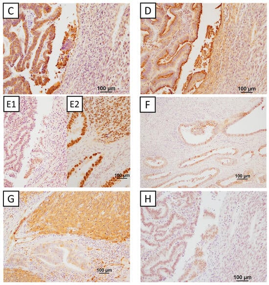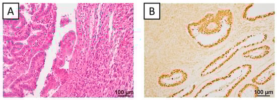 Immunohistochemistry was performed on 18 DDEC samples, and the expression of PAX8, cytokeratin, epithelial membrane antigen, p53, E-cadherin, fascin, ARID1A, and MMR proteins (MLH1, PMS2, MSH2, and MSH6) was evaluated. These markers were selected based on previous studies indicating their prognostic relevance in DDEC [,]. Detailed antibody information is provided in Table 4. Staining procedures followed the manufacturer’s instructions [,,], and evaluations were conducted by two researchers (H.H. and M.N.) using a double-blind method.