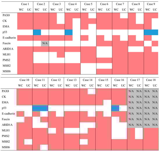 Summary of immunohistochemical findings. WC, well-differentiated component; UC, undifferentiated component; CK, cytokeratin; EMA, epithelial membrane antigen; N/A, not performed. Positive results are indicated in red, and negative results are indicated in white (for p53, wild-type is blue, mutant is white).