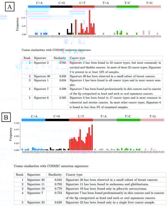 Mutation signatures. (A) Signature 2 exhibits the highest similarity with the mutation profile of the WC in case 1. (B) Signature 30 exhibits the highest similarity with the mutation profile of the UC in case 1. WC, well-differentiated component; UC, undifferentiated component.