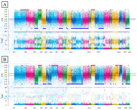 The copy number alteration plot. The horizontal axis represents the chromosome location, and the vertical axis represents the gene copy number. (A) The CNA plot of the WC in case 1. (B) The CNA plot of the UC in case 1. CN, copy number; CNA, copy number alteration; VAF, variant allele frequency; WC, well-differentiated component; UC, undifferentiated component.