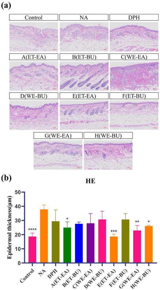 (a) Hematoxylin–eosin-stained skin epidermal thickness puzzle (scale bar = 100 μm; n = 4). (b) Hematoxylin–eosin-stained mice skin epidermal thickness histogram (* p < 0.05, ** p < 0.01, *** p < 0.001, **** p < 0.0001). Note: Control represents the blank group; NA represents the histamine model group; DPH represents the antihistamine positive group; A (ET-EA) represents the ethanol extraction followed by ethyl acetate extraction group of ziyehuangxin leaves (P.L.); B (ET-BU) represents the ethanol extraction followed by n-butanol extraction group of ziyehuangxin leaves; C (WE-EA) represents the water extraction followed by ethyl acetate extraction group of ziyehuangxin leaves; D (WE-BU) stands for water extraction followed by n-butanol extraction group of ziyehuangxin leaves; E (ET-EA) stands for ethanol extraction followed by n-butanol extraction group of SC9 leaves; F (ET-BU) stands for ethanol extraction followed by n-butanol extraction group of SC9 leaves; G (WE-EA) stands for water extraction followed by ethyl acetate extraction group of SC9 leaves; and H (WE-BU) stands for water extraction followed by n-butanol extraction group from SC9 leaves.