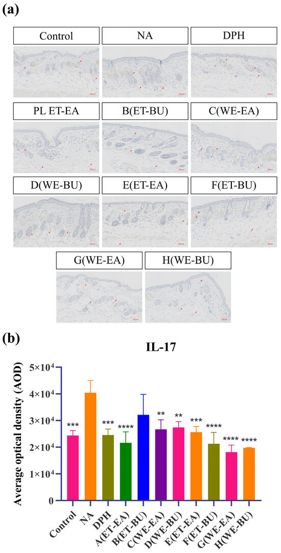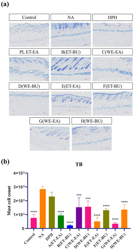 Mast cells are immune cells in tissues, responsible for regulating inflammatory and immune responses. To investigate their anti-inflammatory capabilities, we performed toluidine blue staining on mast cells. The blue-purple spots in the tissue represent mast cells (Figure 2). Compared with the model group (NA), the number of mast cells in the treatment groups (A–H) and the positive control group (DPH) decreased. Additionally, the number of mast cells in G.L. was significantly lower than that in P.L. Furthermore, the total number of mast cells was the lowest in the P.L. treated with ET-BU (Group B).