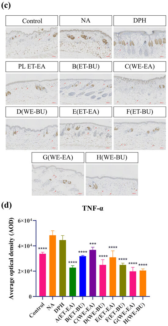 (a) IL-17 expression puzzle (scale bar = 100 μm; n = 4). (b) IL-17 expression histogram (** p < 0.01, *** p < 0.001, **** p < 0.0001). (c) TNF-α expression puzzle (scale bar = 100 μm; n = 4). (d) TNF-α expression histogram (*** p < 0.001, **** p < 0.0001). Note: Control represents the blank group; NA represents the histamine model group; DPH represents the antihistamine positive group; A (ET-EA) represents the ethanol extraction followed by ethyl acetate extraction group of ziyehuangxin leaves (PL); B (ET-BU) represents the ethanol extraction followed by n-butanol extraction group of ziyehuangxin leaves; C (WE-EA) represents the water extraction followed by ethyl acetate extraction group of ziyehuangxin leaves; D (WE-BU) stands for water extraction followed by n-butanol extraction group of ziyehuangxin leaves; E (ET-EA) stands for ethanol extraction followed by n-butanol extraction group of SC9 leaves; F (ET-BU) stands for ethanol extraction followed by n-butanol extraction group of SC9 leaves; G (WE-EA) stands for water extraction followed by ethyl acetate extraction group of SC9 leaves; and H (WE-BU) stands for water extraction followed by n-butanol extraction group from SC9 leaves.