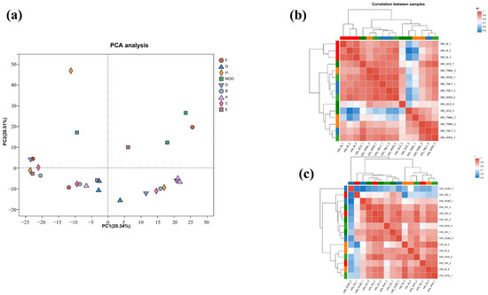 (a) PCA diagram; (b) sample correlation coefficient diagram for groups A, B, C, and D; (c) sample correlation coefficient diagram of groups E, F, G, and H.