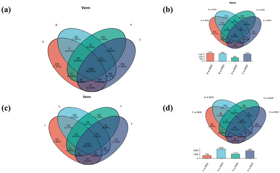 Venn analysis of inter-samples in each group was also performed. Among them, there were 14,693 common genes in groups A, B, C, and D, and 14,724 common genes in groups E, F, G, and H (Figure 5a,c). Subsequently, comparison of the differential gene set was also analyzed between the model group and the experimental group (Figure 5b,d). The gene numbers of B vs. MOD and D vs. MOD were 1684 and 1777, respectively, accounting for 17.28% of the total genes, indicating that the B and D treatments may have similar mechanisms in the treatment of atopic dermatitis. The most differential genes were found in group G vs. MOD, which may be due to more gene regulation during treatment. The common differential genes of G vs. MOD and E vs. MOD accounted for 19.34%, which suggested that they had similar gene regulation of atopic dermatitis.