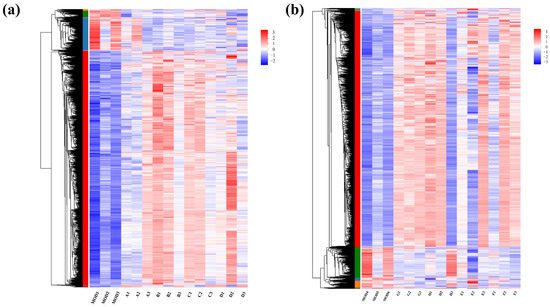 In the RNA-seq cluster heat map, expression pattern cluster analysis was performed for the genes in the selected set. Red indicates that the genes had a high expression level in the sample, while blue indicates a low expression level. The left side is the gene clustering tree, and the right side is the gene name. Proximity of gene branches reflects similar expression levels. As shown in Figure 6, there were effective differences in most genes between the experimental group and the control group, and experimental group genes exhibited higher expression than the controls. Nevertheless, expression patterns were consistent within experimental groups, indicating functional correlation among similarly expressed genes.