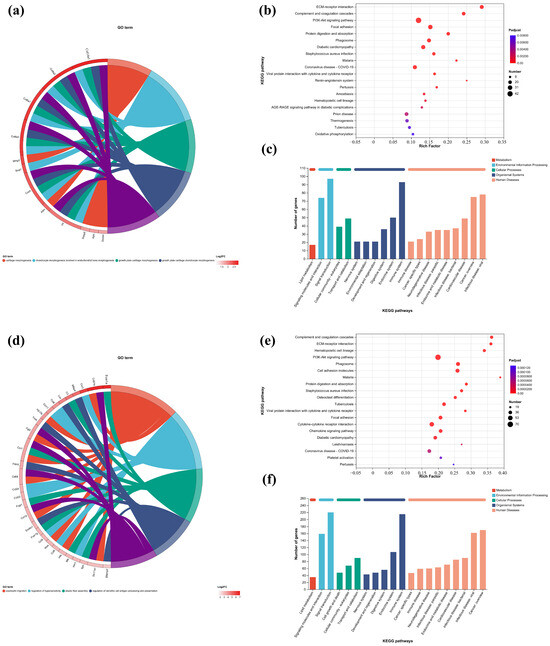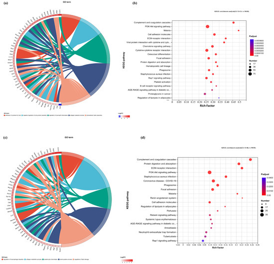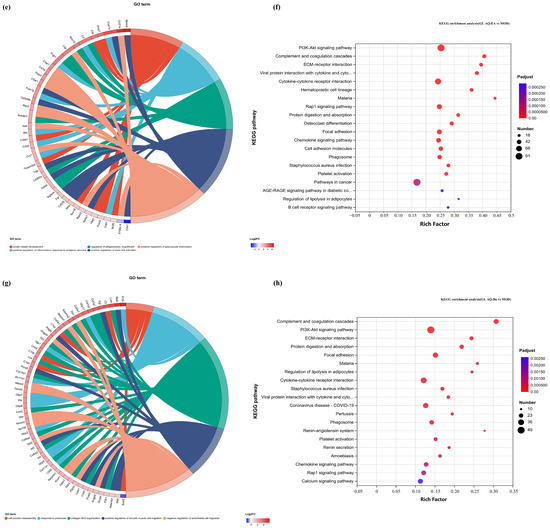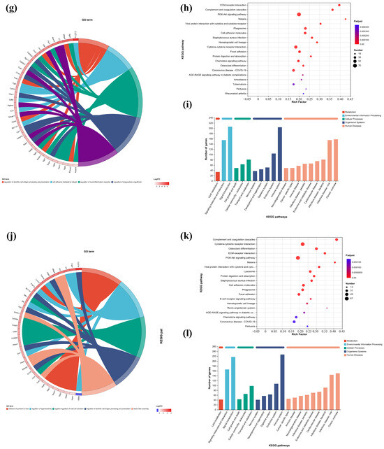 In this study, the first five GO terms with p < 0.05 significant levels were enriched (Figure 7a,d,h,k and Figure 8a,c,e,g). The KEGG pathway with greater enrichment (p < 0.05) and more genes (n ≥ 6) was enriched in the experimental group compared to the control group (Figure 7b,e,i,l and Figure 8b,d,f,h).