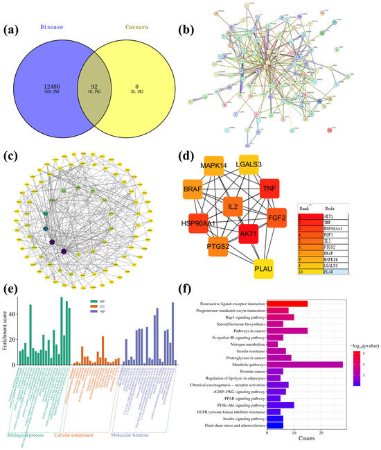 (a) Cassava leaf extracts, atopic dermatitis, and skin repair intersection gene Venn diagram; (b) PPI network diagram; (c) “Component-Target-Pathway” network diagram; (d) enrichment of top 10 core targets; (e) GO enrichment analysis diagram of cassava leaf extract in relation to skin inflammation; (f) KEGG enrichment analysis diagram of cassava leaf extract in relation to skin inflammation.