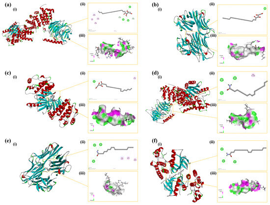 Binding modes of the compounds with the target proteins: (a) AKT1 with 1-stearoylglycerol; (b) TNF with 1-stearoylglycerol; (c) BRAF with 1-stearoylglycerol; (d) AKT1 with oleamide; (e) TNF with oleamide; and (f) BRAF with oleamide. Each panel is divided into three sections: (i) the 3D structure of the complex, (ii) the 2D binding mode of the complex, and (iii) the hydrogen bond donor–acceptor network of the complex. AKT1: Protein Kinase B alpha; TNF: Tumor Necrosis Factor; BRAF: B-Raf proto-oncogene, serine/threonine kinase.