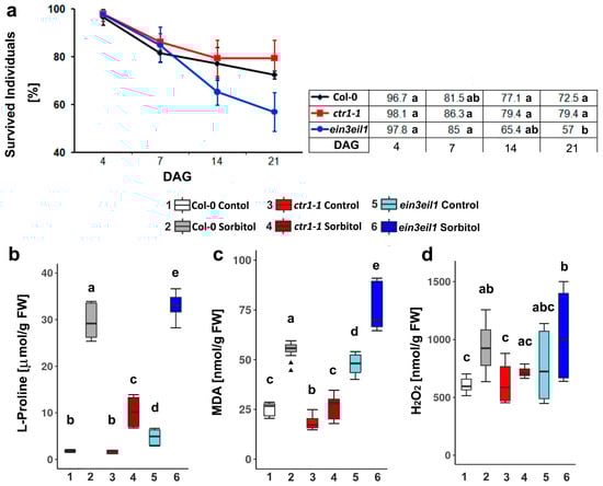 Percentage of survived individuals (error bars represent standard deviation, n ≥ 20) (a), and levels of stress markers: free L-Proline (b), malondialdehyde (MDA) (c), and hydrogen peroxide (d) accumulated in Col-0, ctr1-1,and ein3eil1 plants grown on ½ MS −/+ 75 mM sorbitol for 21 days after germination (DAG) (different letters indicate statistically significant differences at p < 0.05, one-way ANOVA with Tukey’s HSD post-hoc test; the outliers in the box plots are indicated with triangles).