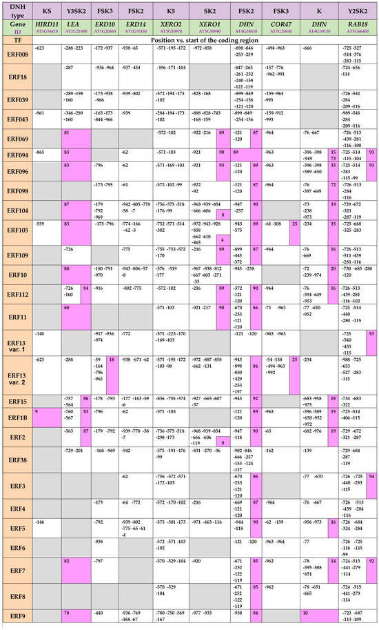 Positions of Ethylene Response Factors (ERF)-binding sites in the promoter regions of Arabidopsis thaliana dehydrin-coding genes according to Eukaryotic Promoter Database, (https://epd.expasy.org/epd/, accessed on 11 May 2024). The grey color indicates the lack of sites for a specific ERF, and the pink color marks binding sites located downstream of TSS.