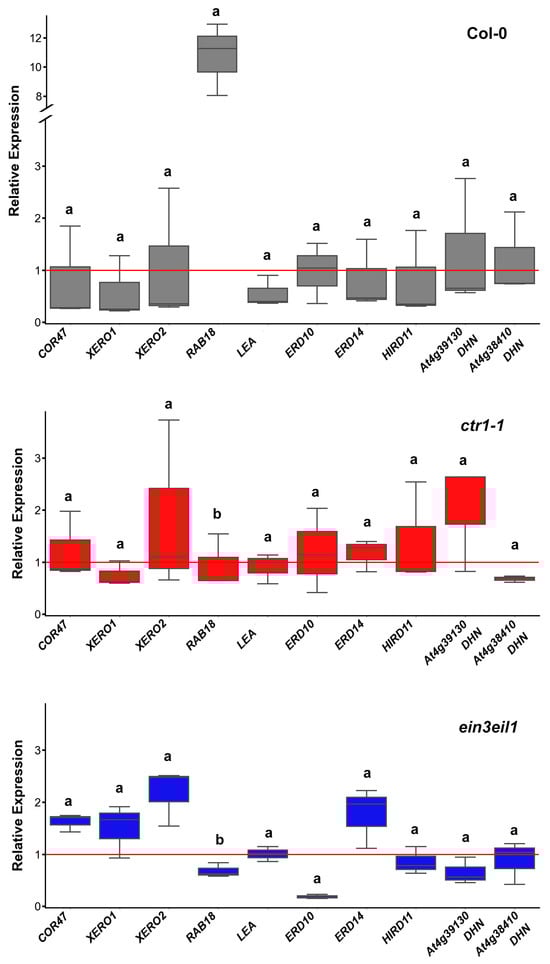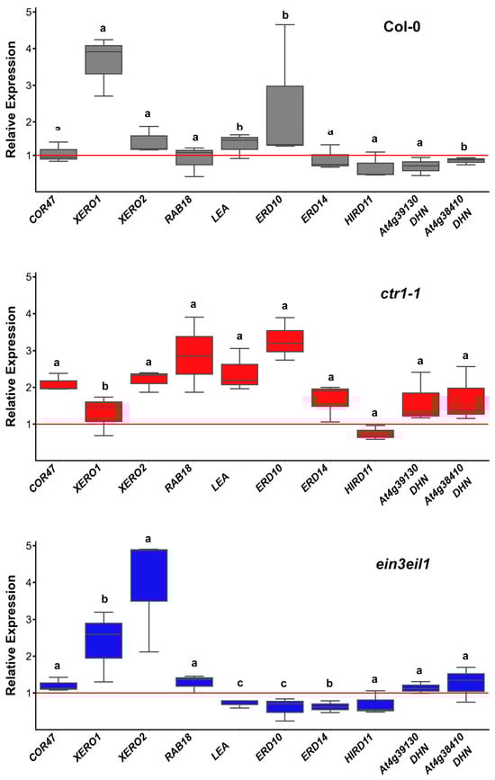 Relative expression of dehydrin genes in the leaves of wild-type (Col-0), the constitutive ethylene response mutant (ctr1-1) and the ethylene-insensitive double mutant (ein3eil1) grown on 1/2 MS medium −/+ 75 mM sorbitol. The plots represent data from three independent experiments, depicting the median (horizontal line in each box), the lowest and the highest values (whiskers endpoints). The red line indicates the basal expression level of each gene measured in control samples of the same genotype. Different letters indicate statistically significant differences in gene expression among the three genotypes (p < 0.05, one-way ANOVA).
