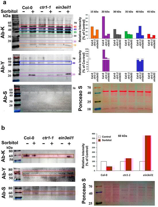Immunodetection of dehydrin proteins was performed on total soluble protein extracts from the leaves and roots of 21-day-old control and sorbitol-stressed plants. Equal amounts of soluble protein (10 µg) from each experimental group were separated via 10% SDS-PAGE and subsequently transferred onto nitrocellulose membranes. The membranes were probed with three different primary antibodies recognizing the conservative dehydrin segments K, Y, and S (Figure 5). To confirm equal protein loading across samples, the intact membranes were visualized by transient Ponceau S staining prior to immunoblotting (Figure 5 and Supplementary Materials Figure S3). As an internal reference, we developed equally loaded membranes and probed them with a monoclonal plant-specific actin antibody (Supplementary Materials Figure S3). The reference protein showed equal actin abundance in the leaf samples of the tested genotypes but varying levels in the root samples with stronger immunosignal in ctr1-1 roots compared to Col-0- and ein3eil1-derived samples.