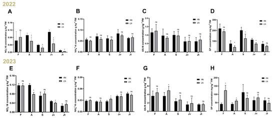 Effects of nutrient management on SN and SP allocation in different parts of pomelo fruits. (A) NO3−-N concentration in 2022; (B) NH4+-N concentration in 2022; (C) AA-N concentration in 2022; (D) SP concentration in 2022; (E) NO3−-N concentration in 2022; (F) NH4+-N concentration in 2022; (G) AA-N concentration in 2022; (H) SP concentration in 2022. SN: NO3−-N, NH4+-N, AA-N; LN: application with fertilization as 160 kg N. ha−1; HN: application with fertilization as 320 kg N. ha−1; (A–H): n = 6, Student’s t-test. *: p < 0.05, ns: no significant difference.