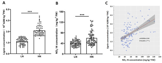 Field trails with low N (LN) or high N (HN) treatments were performed in 11 pomelo orchards to evaluate the relationship between lignification and NO3−-N. The Jv concentrations of lignin and NO3−-N under HN conditions were 86.13% and 48.84% higher, respectively, than in LN treatments (Figure 3A,B). Furthermore, lignin concentration was significantly positively correlated to NO3−-N concentration (Figure 3C). These results confirmed that nitrate was a pivotal nutrient for determining the extent of lignification in the Jv of pomelo fruits.