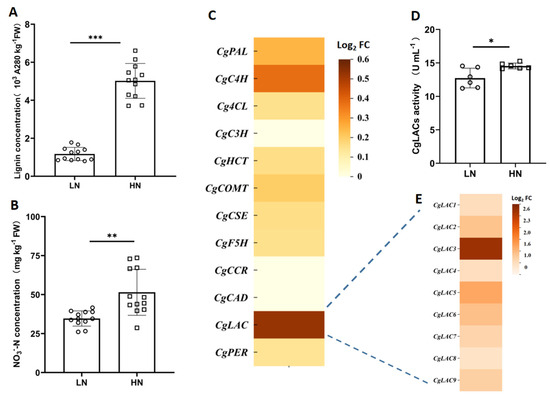 Screening candidate genes for involvement in NO3−-N regulation of lignification. (A) Lignin concentration; (B) NO3−-N concentration; (C) heat-map of gene expression differences between HN and LN quantified in RNA-Seq analysis; (D) enzyme activity of CgLAC. (E) heat-map of CgLAC expression differences observed in RT-qPCR analysis; (A,B) n = 12, (D) n = 6; *: 0.01 < p ≤ 0.05; **: 0.001 < p ≤ 0.01; ***: p < 0.001.