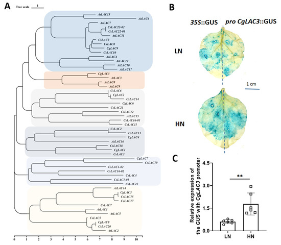 Phylogenetic analysis of CgLAC3 in plants and its promoter responses to nitrate. (A) Phylogenetic analysis of laccase genes from pomelo and Arabidopsis; (B) GUS staining of transgenic tobacco leaves; (C) GUS expression with CgLAC3 promoter. At, Arabidopsis thaliana; Cs, Citrus sinensis. LN: 0.10 g NO3− kg−1; HN: 10.0 g NO3− kg−1. (C) n = 6. **: p < 0.01.