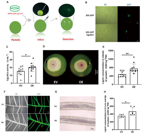 Overexpressing CgLAC3 promotes lignification in both pomelo peel albedo and soybean hairy roots. (A) Schematic diagram of CgLAC3 transformation in young pomelo peels; fluorescence signal detection in pomelo peels (B) and soybean hairy roots (F); (C) CgLAC enzyme activity; in situ Wiesner staining of lignin in pomelo albedo (D) and soybean hairy roots (G); Lignin concentration in pomelo albedo (E) and soybean hairy roots (H). (C,E) n = 12, (H) n = 6; *: 0.01 < p ≤ 0.05 and **: 0.001 < p ≤ 0.01.