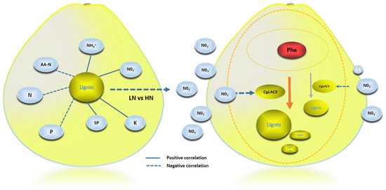 Lignin is extremely important for plant growth and development. Its biosynthesis and accumulation are also affected by nutrient management, particularly nitrogen (N) application. However, specifics of how N affects lignification remain contentious in available reports. For instance, excessive N fertilizer application may reduce the mechanical strength of stalks in buckwheat and rice by limiting cellulose and lignin concentrations [38,39], while increasing lignin accumulation in rapeseed roots [37]. Under low N conditions, Wang et al. [38] observed notable declines in apple rootstock lignin concentrations. Many forms of N exist in plants and soils, including organic and inorganic forms [40]. It also was reported that the cell wall from high NO3− supply concentration is notably thicker, and the lignin content was lower under lower NO3− supply [19]. This variety of N forms plays different roles in plant growth and development [39,40]. Apparent controversy originating from conclusions drawn in studies of N effects on lignification as described above might be clarified by accounting for the specific contributions to plant lignification provided by each of the different forms of N that plants may acquire and utilize.